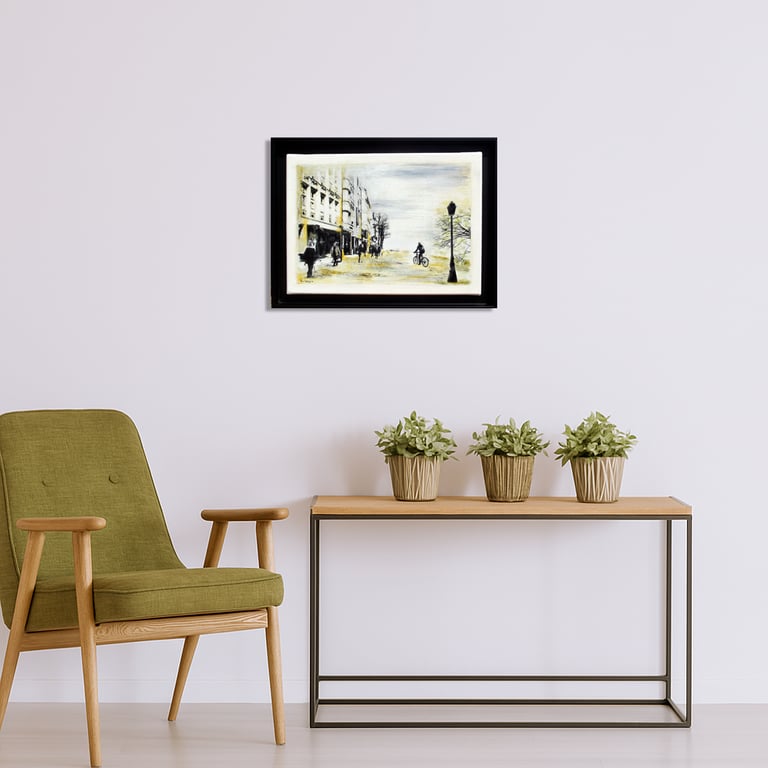 Réalisé par peinture et collage sur toile, rehaussé par un cadre noir.