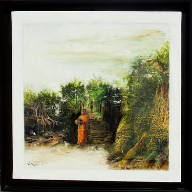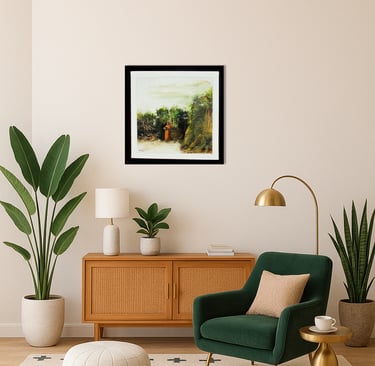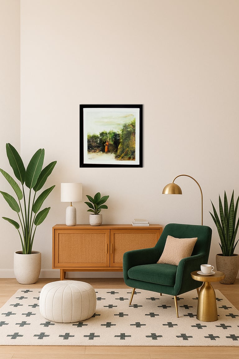 Sérénité et fraicheur pour cette oeuvre en technique mixte peinture à l'huile sur toile et collage.