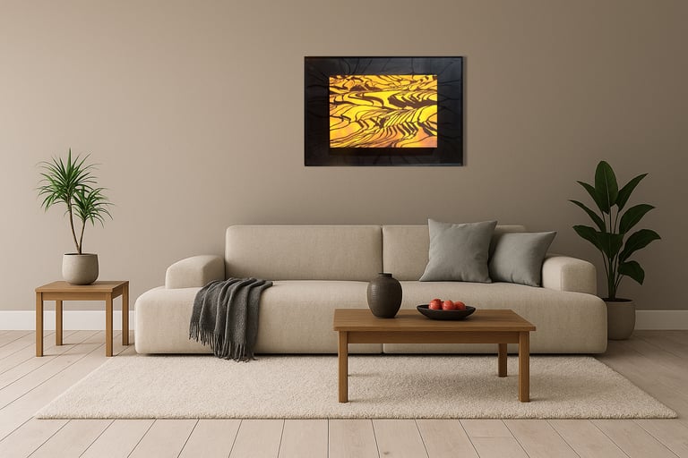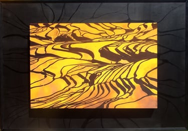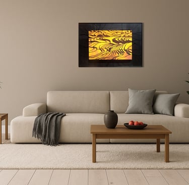 Dépaysement assuré avec cette œuvre aux couleurs chaudes d’un coucher de soleil se reflétant sur l’eau