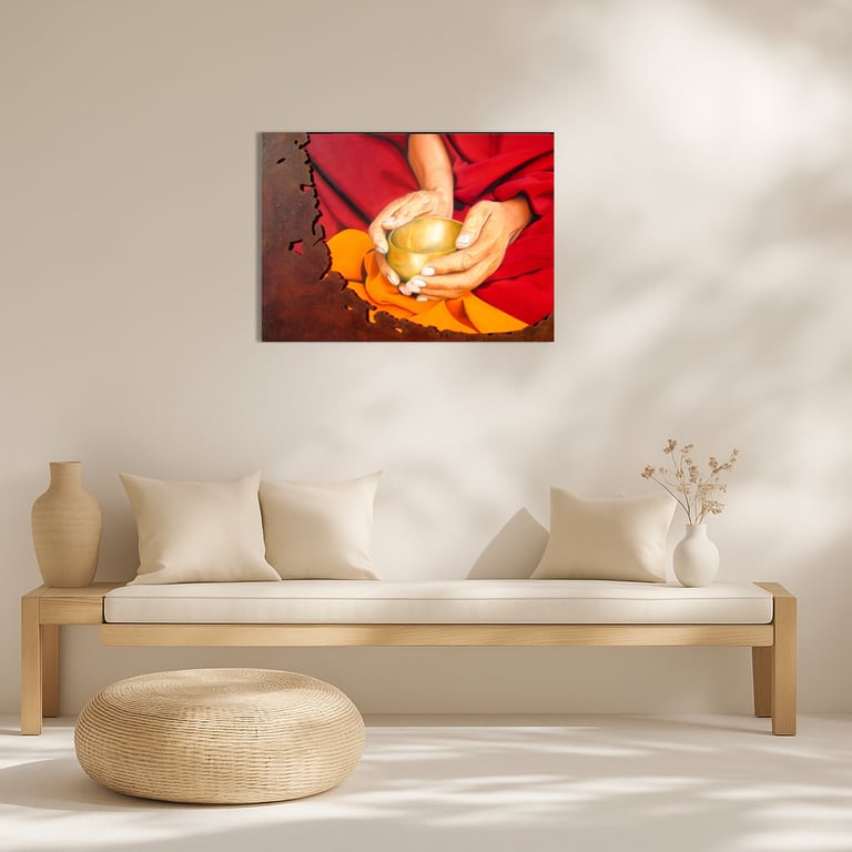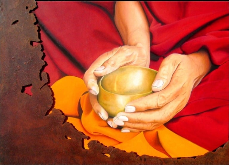 Inspiration Tibet pour cette œuvre chaude et colorée. La peinture montre avec sobriété la texture du tissu et le métal du bol tibétain avec en superposition le métal rouillé qui accentue l’aspect « matière ».