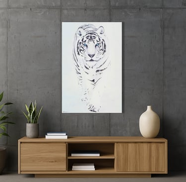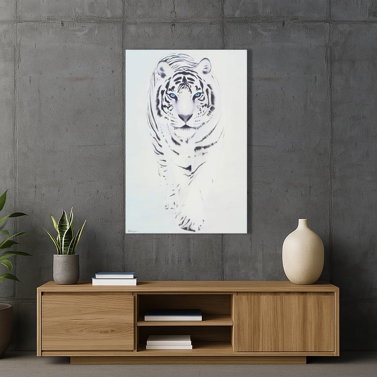 Tout en nuances de blancs pour souligner la pureté de l’animal dans la neige. Seul le regard d’un bleu éclatant amène une touche subtile de couleur azur. Stylisé et pourtant parfaitement figuratif, le tigre représente une force tranquille.